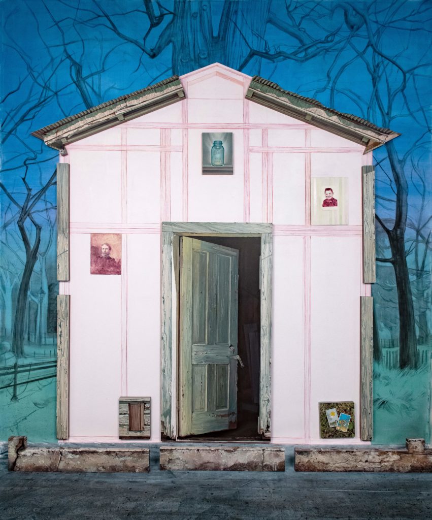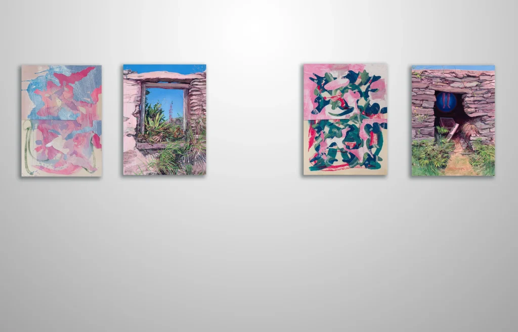 A monumental public installation mixing a painted backdrop and paintings.